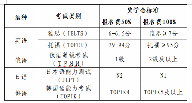 学生在校期间参加出国外语水平考试,根据考试成绩,学校提供奖学金,具体标准如下: